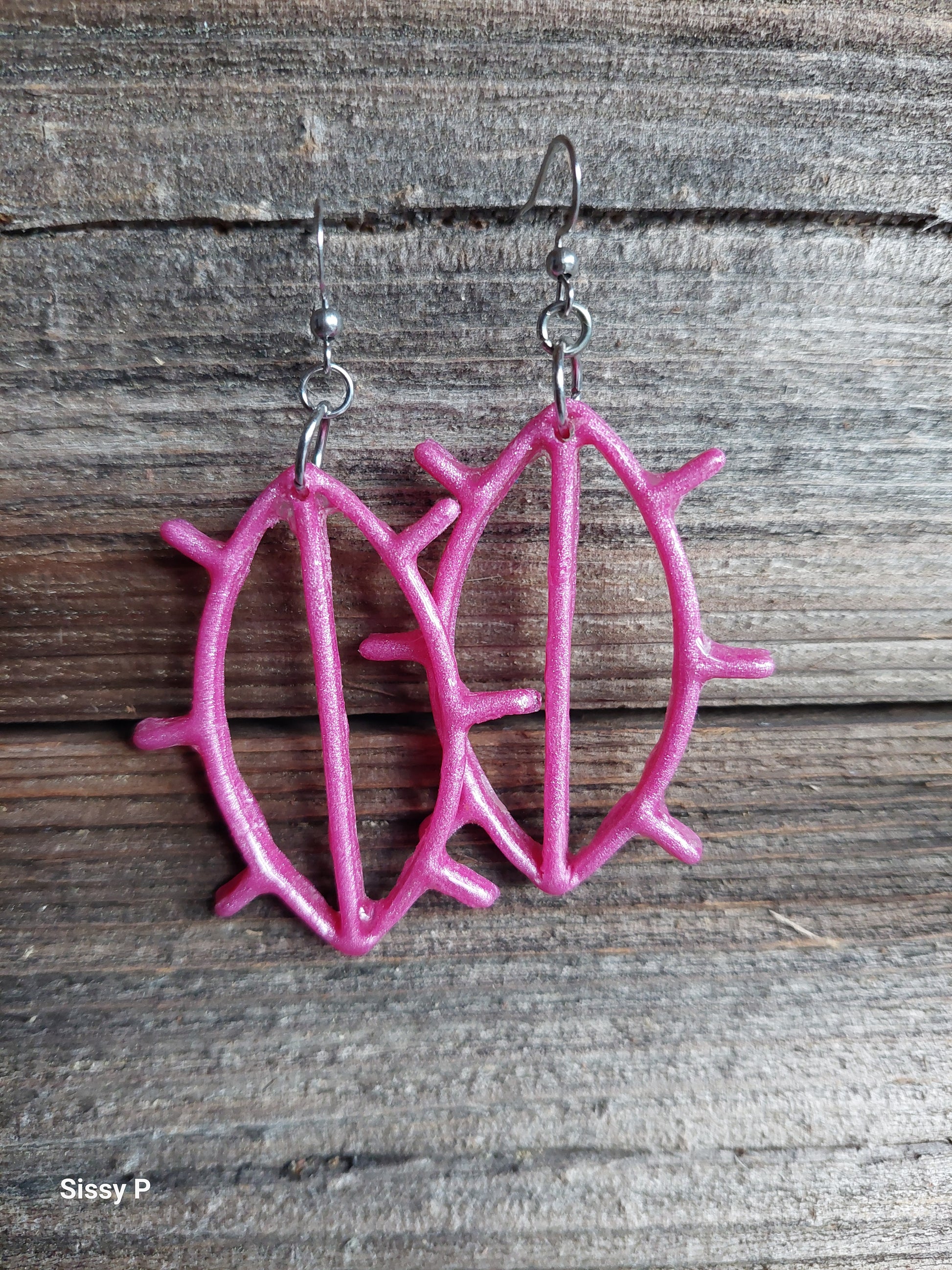 Pituus n. 7 cm. Värinä metallinhohtoinen pinkki. Koukut ruostumatonta/kirurginterästä.